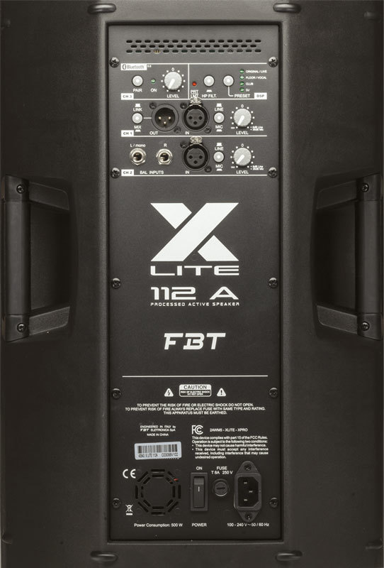 На панели управления расположен трехканальный микшер с двумя микролинейными входами, стерео входом и выделенным каналом для bluetooth 5.0; два xlr входа, стерео вход, XLR выход с селектором ch1 или mix link, HP фильтр, два селектора микрофонных линий, селектор предустановок DSP, bluetooth 5.0 с индикатором сопряжения. 4 точки крепления M10, встроенные в корпус, а также дополнительные монтажные скобы позволяют устанавливать колонки FBT XLITE 112A на стены или потолки.