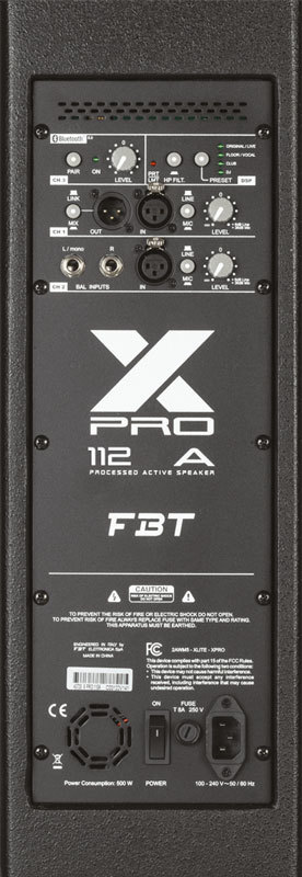 FBT XPRO 112A — активная двухполосная акустическая система, усилители низкой частоты 1200Вт + высокочастотный 300 Вт, частотный диапазон 50 Гц - 20 кГц, интегрирован 3-канальный микшер с Bluetooth версии 5.0.