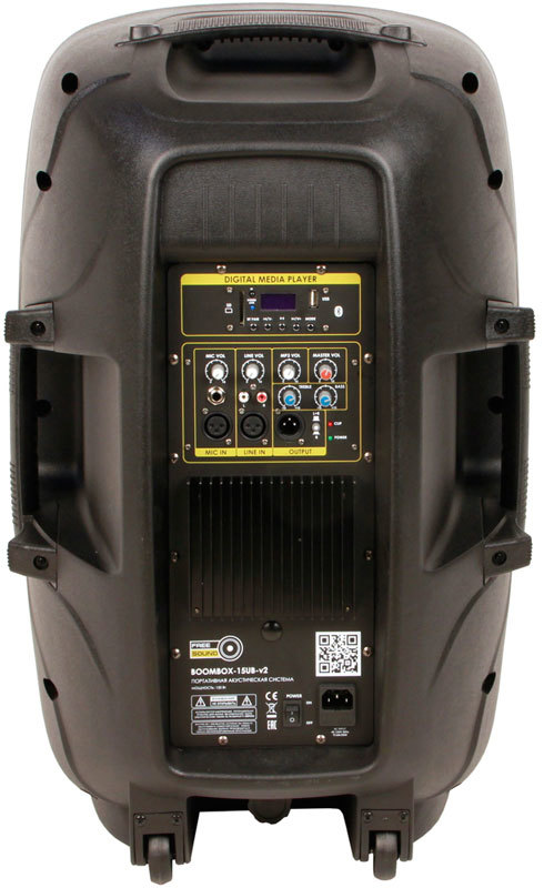 FREE SOUND BOOMBOX-15UB-v2 - активная акустическая система, 1+15'', 150 Вт, XLR микр/XLR лин/RCA входы, XLR-выход, USB/SD MP3-проигрыватель, стерео Bluetooth A2DP, FM-радио, пластик, вес 13 кг