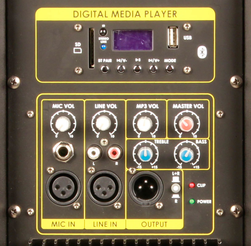 - Каждая система имеет встроенный микшерный пульт с одним микрофонным входом (XLR и TRS, для подключения только динамических микрофонов и радиосистем), с одним линейным входом (XLR и RCA x 2) с отдельными регуляторами громкости. Также отдельный регулятор громкости имеет и встроенный MP3-проигрыватель. Таким образом, в общей сложности имеется возможность использования 3-х независимых источников звука, что в большой части случаев позволит вообще обойтись без внешнего микшерного пульта.