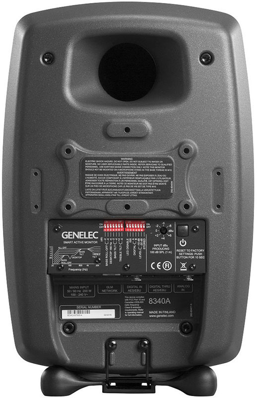 Genelec 8340APM активный двухполосный монитор ближнего / среднего поля. НЧ 6.5" 150 Вт, ВЧ 0.75" 150 Вт. Подставки. Опциональная настройка GLM калибратором. Вход: аналог. XLR, вх/вых цифр. XLR (AES/EBU), 2xRJ45 для работы с GLM системой. Макс. SPL 110 дБ, 38 Гц-22 кГц (±6 дБ). Кроссовер 2600Гц. Габариты (ВхШхГ): 365х237х223мм (с подставками). Вес 8.4 кг. Темный