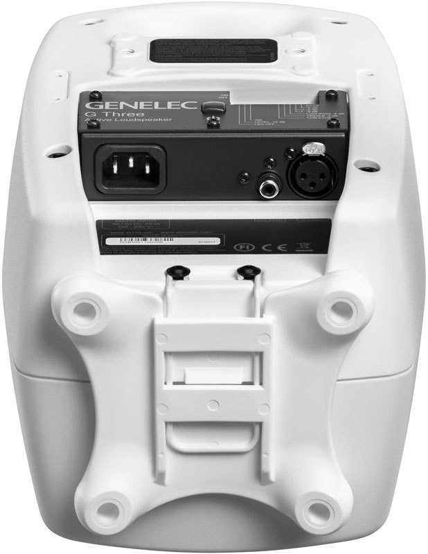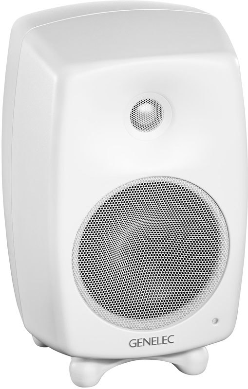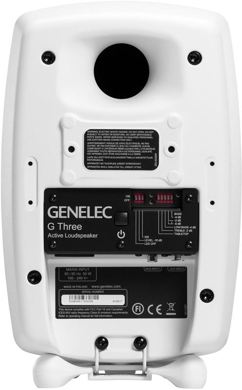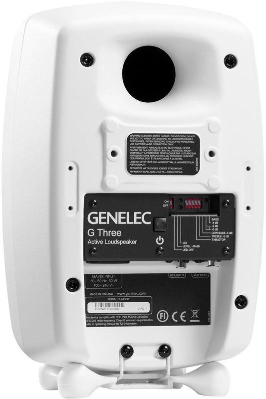Genelec G Three BW активная 2-полосная акустическая система. НЧ 5'' 50 Вт, ВЧ 0.75'' 50 Вт. Подставки. Входы: аналог. RCA, XLR. Макс. SPL 104 дБ, 47 Гц - 25 кГц (-6 дБ). Кроссовер 3000 Гц. Габариты (ВхШхГ): 299х189х178 мм (с подставками). Вес 5.0 кг. Белая