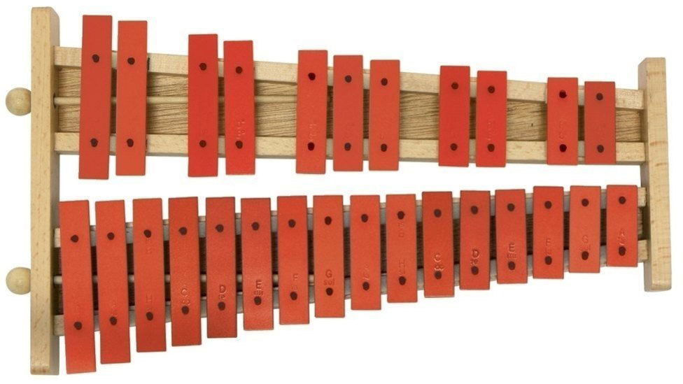 Gewa 847008 Bells G27R - хроматический металлофон, 27 красных стальных пластин из специального сплава, диапазон G-А. В комплекте - чехол, 2 деревянных палочки, держатель для палочек.