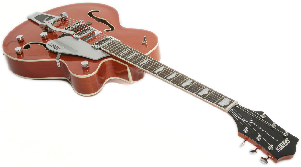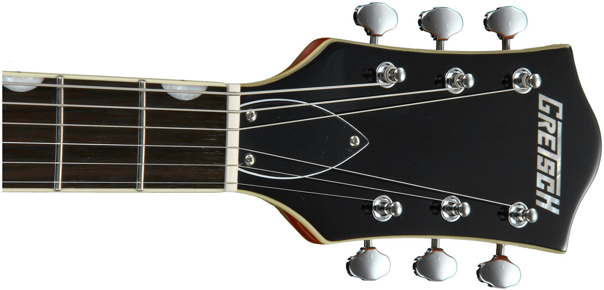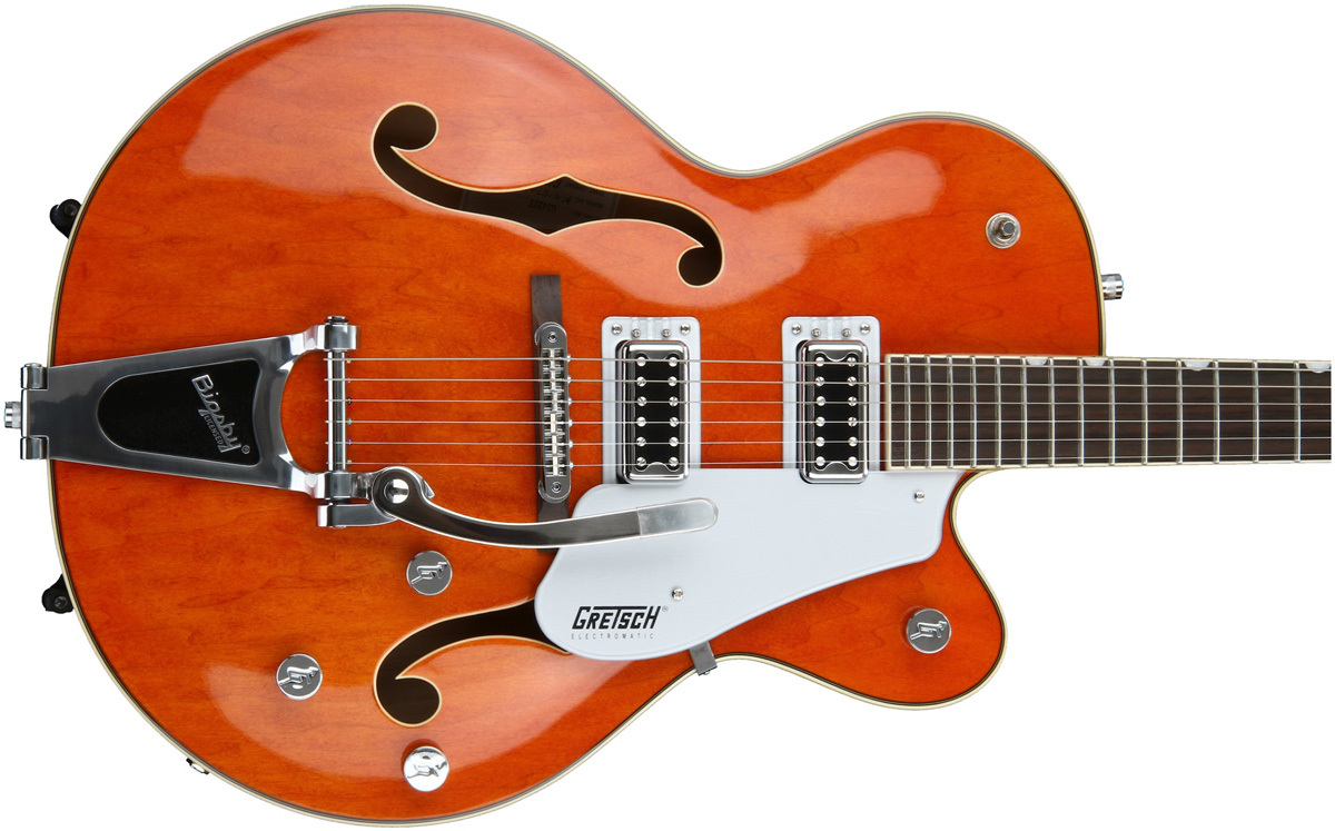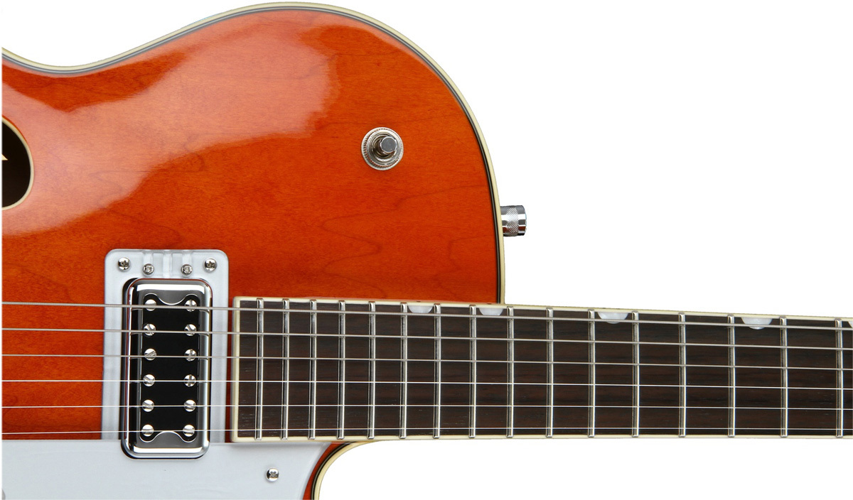 GRETSCH GUITARS G5420T ELECTROMATIC HOLLOW BODY ORANGE декорирована перламутровой инкрустацией в виде бугорков, имеет полуоткрытые колки в винтажном стиле и хромированную фурнитуру.