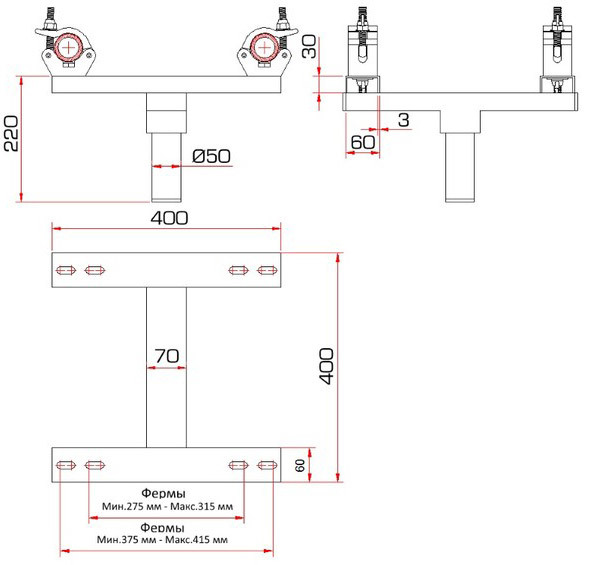 GUIL ADT-15 - адаптер с четырьмя алюминиевыми струбцинами, регулируемый 27,5 - 41,5 (см), Ø 50 мм, для установки ферм на подъёмники ELC-506 и ELC-640. Благодаря регулируемой конструкции, адаптер может быть использован для различных ферм.