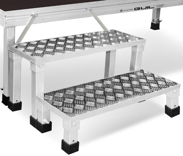 GUIL ECD лестницы алюминиевые 100% предназначены для использования с подиумом высотой 40, 60, 80 и 100 (см). Верхняя нескользящая поверхность ступеней (алмазная обработка) также выполнена из алюминия. Ступени соединяютя между собой винтами, а верхняя ступень снабжена двумя соединительными пластинами для крепления к подиуму.