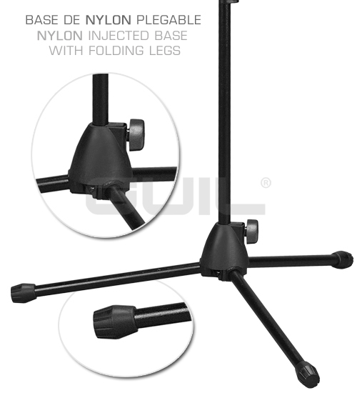Основание: Нейлоновое основание с металлическими складными ножками делает стойку очень удобной для транспортировки. Складные ножки имеют нескользящие резиновые опоры, обеспечивающие идеальное сцепление с полом и, соответственно, устойчивость стойки без повреждения поверхности, на которой она установлена.