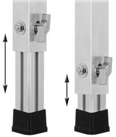 На внутренних сторонах профиля расположены рёбра жёсткости 10х1 (мм), являющиеся направляющими для внутреннего профиля 44 х 44 (мм), и исключающие возникновение люфта. На основании ножек резиновые заглушки, закреплённые двумя винтами М4.