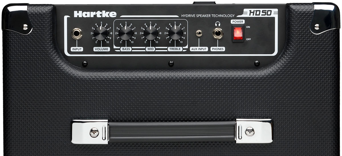 Обладая профессиональными возможностями, HD50 разработан так, чтобы быть легким и надежным в использовании для игроков всех уровней. На верхней панели корпуса расположены регуляторы уровня громкости, баса, средних и высоких частот. Помимо 1/8''-стереовхода (AUX) для подключения, например, МР3-плеера, есть 1/4''-выход для наушников. Ещё HD50 оборудован встроенным ограничителем громкости, чтобы гарантировать эксплуатацию усилителя на безопасных уровнях. Завершает впечатление надежный корпус, выполненный в изысканном стиле с перфорированной стальной решеткой и прессованная ручка для переноски.
