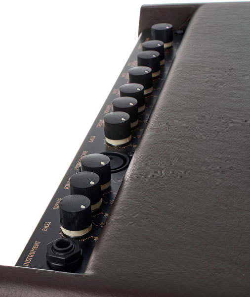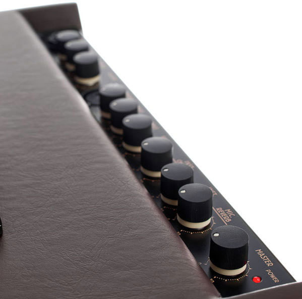 Каждый из каналов предусматривает наличие регуляторов уровня громкости и 2-полосного эквалайзера. Помимо эквалайзера Вы сможете обработать сигнал при помощи встроенных цифровых эффектов хоруса и реверберации, хорус доступен для обработки канала 1, а реверберация для 2 каналов. Эффекты активируются кнопками, а их настройки выполняются при помощи поворотных регуляторов. Для подключения дополнительного музыкального проигрывателя предназначен линейных вход Aux. А в случае необходимости Вы также сможете подключить дополнительную акустическую систему, благодаря наличию линейного выхода.