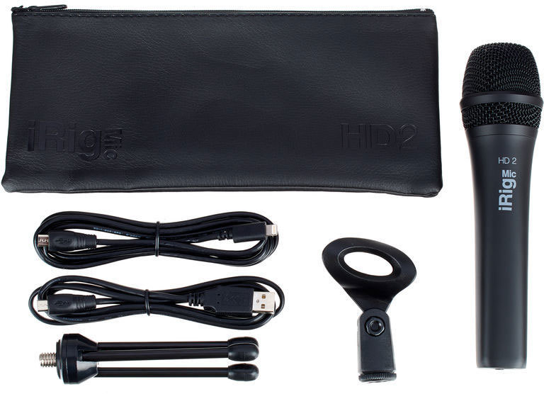 iRig Mic HD 2 поставляется в комплекте со всеми аксессуарами, чтобы максимально использовать его в любой ситуации: сумкой для переноски, компактным настольным штативом, адаптером для микрофонной стойки, переходником с резьбой 5/8 "на 3/8" и кабелями Lightning iOS и USB для подключения устройств.