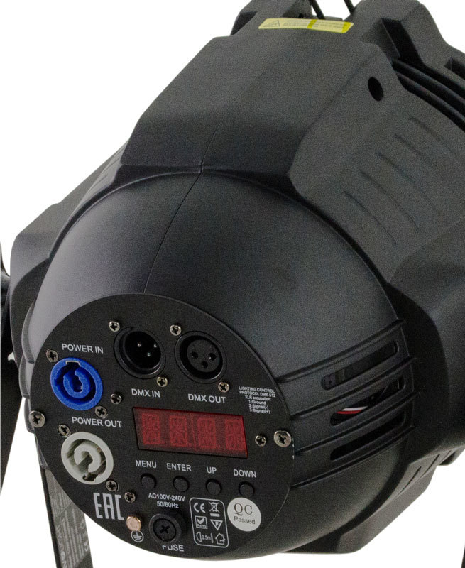 Пользователю доступны 3 различных DMX режима. LCD дисплей с кнопками управления обеспечивает быстрый и удобный доступ к настройкам прожектора. Данная модель отлично подходит для освещения небольших танцполов и инсталляций.