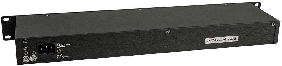 DMX-сплиттер "DMXS8" имеет один вход и восемь выходов. Для подключения на каждый канал предлагается трех-контактный XLR разъём, который служит в качестве DMX-выхода. Каждый DMX-выход имеет независимый трансформатор. С помощью переключателя LINK-выхода возможно завершить или продолжить DMX-сигнал на другие приборы.