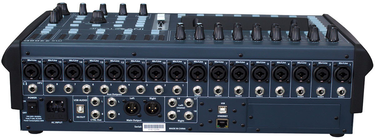 - 22 входа из них 16 универсальных XLR-JACK балансных входов с микрофонными предусилителями , 4 линейных входа, 2 USB разъема