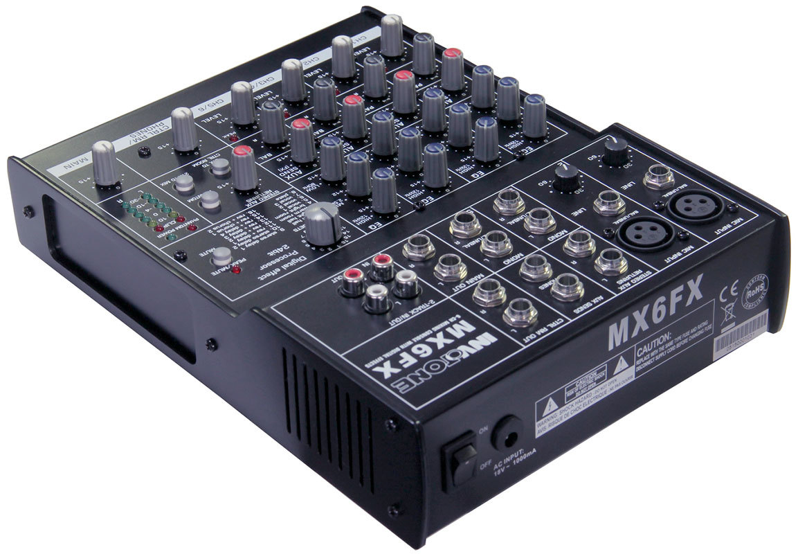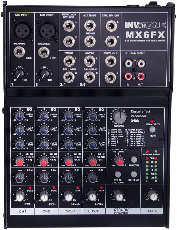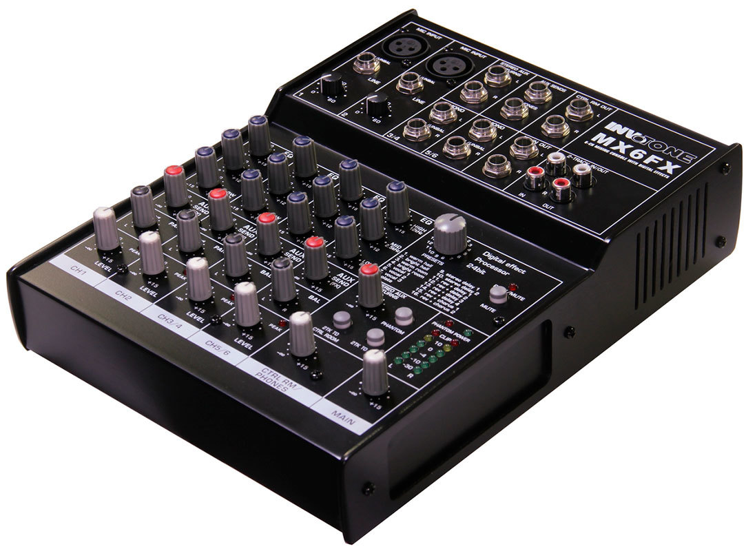 Invotone MX6FX - Микшерный пульт 2 микрофонных входа XLR и балансный Jack, 2 стерео входа
