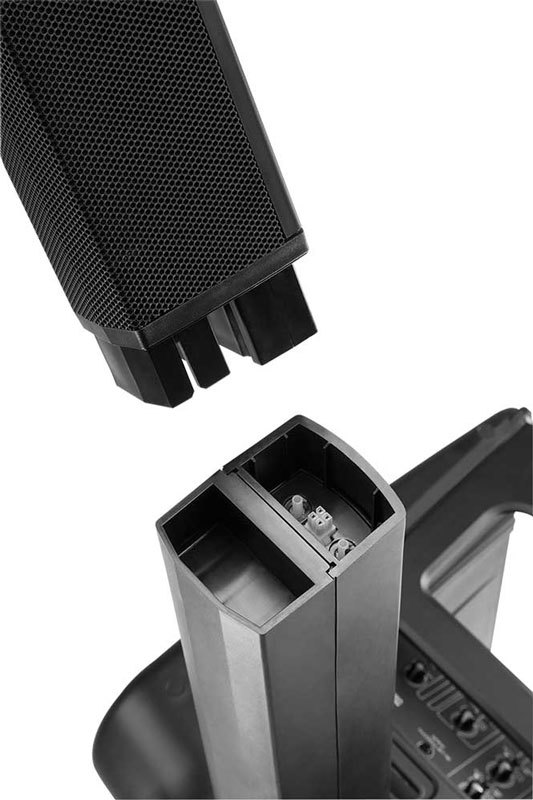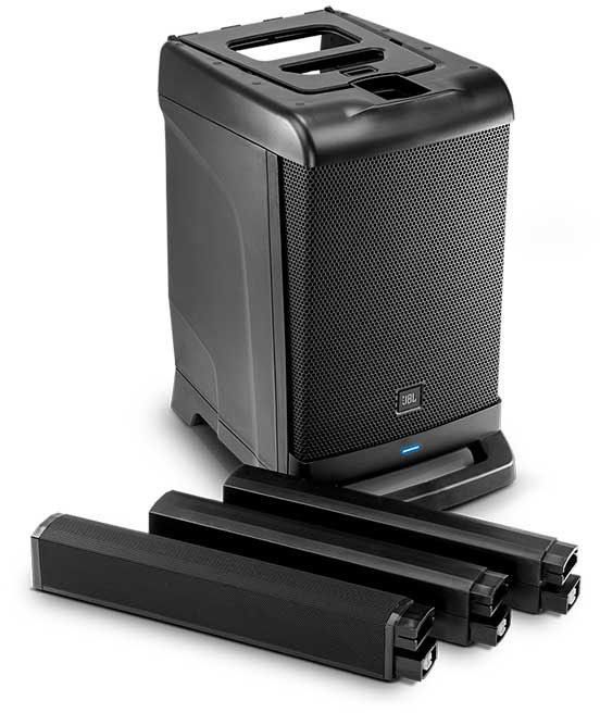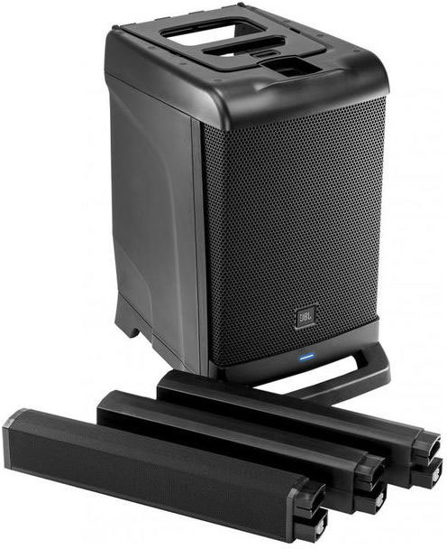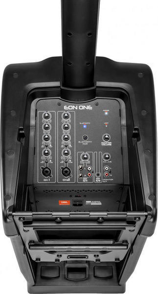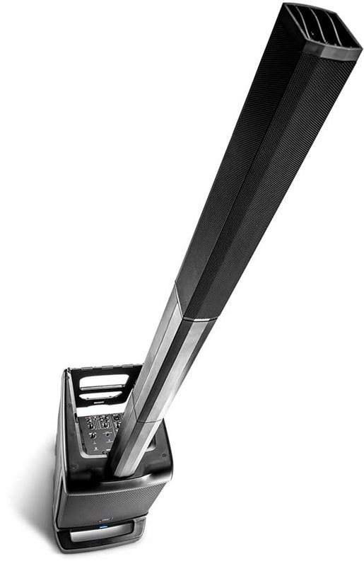 JBL EON ONE - Портативная система «всё-в-одном», состоящая из 254 мм сабвуфера, разбирающего линейного массива с шестью 50 мм ВЧ-динамиками и микшера со всей необходимой коммутацией. Общая мощность 380 Вт, максимальное звуковое давление 118 дБ. Потоковое аудио через Bluetooth. Легко устанавливается и собирается в комплект, который можно переносить одной рукой.