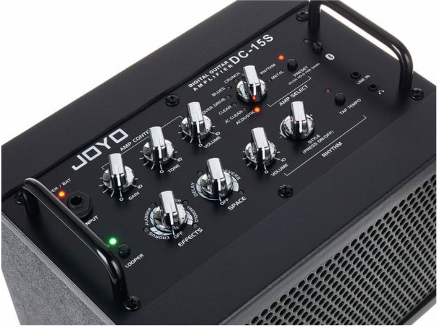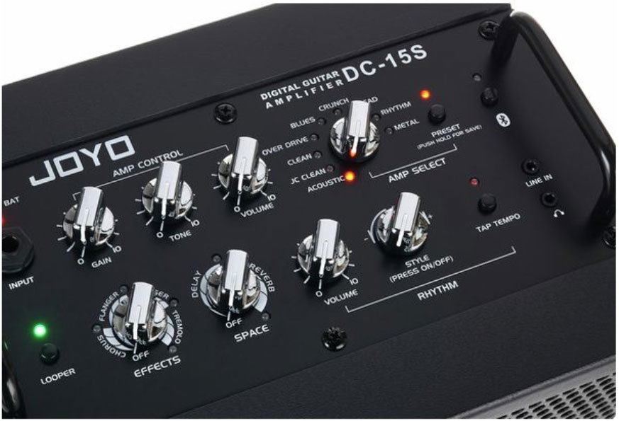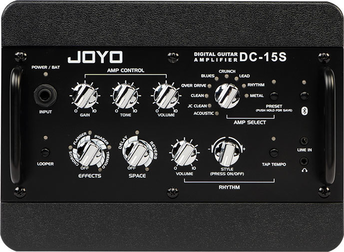 - Элементы управления: усиление, тон, громкость (для усилителя), пространственные эффекты, эффект модуляции, выбор усилителя, предустановка усилителя, Bluetooth, лупер, громкость ударных, стиль ударных, Tap tempo.