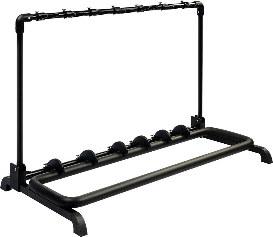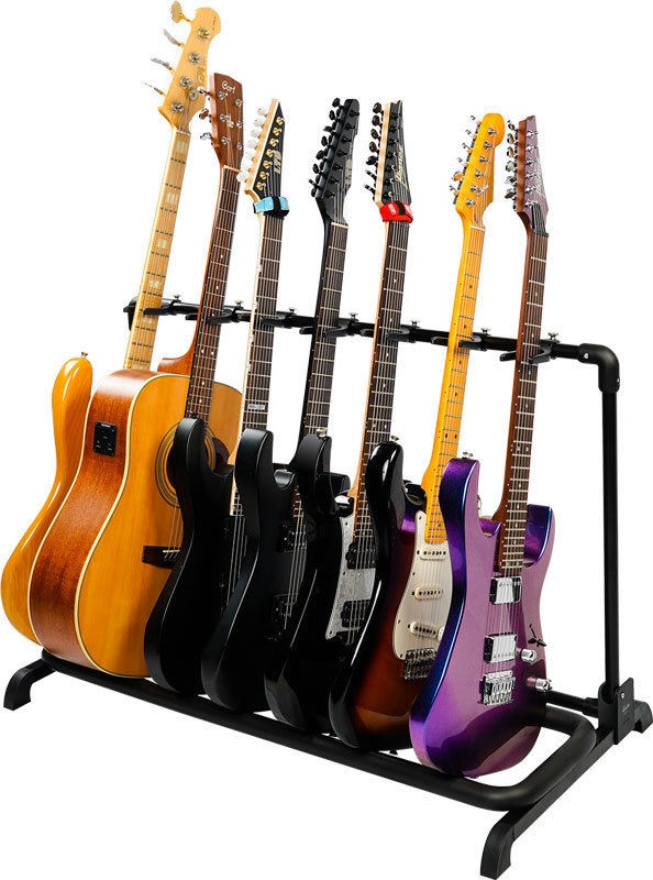 Это стойка для 7 гитар, на ней можно разместить 3 акустические и 2 электрогитары с приличным пространством между ними. Можно легко разместить 7 электрогитар, рекомендутся для дома или сцены.