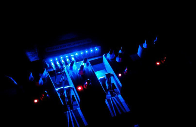 - У блока питания продолговатый стальной корпус, подходящий для большинства педалбордов