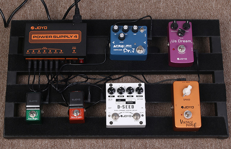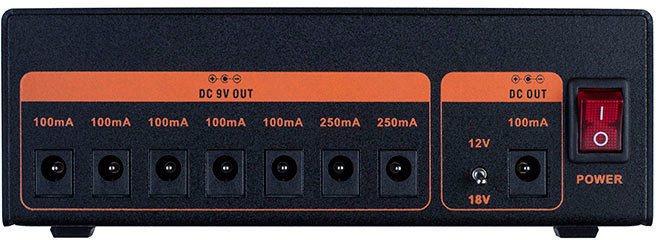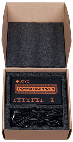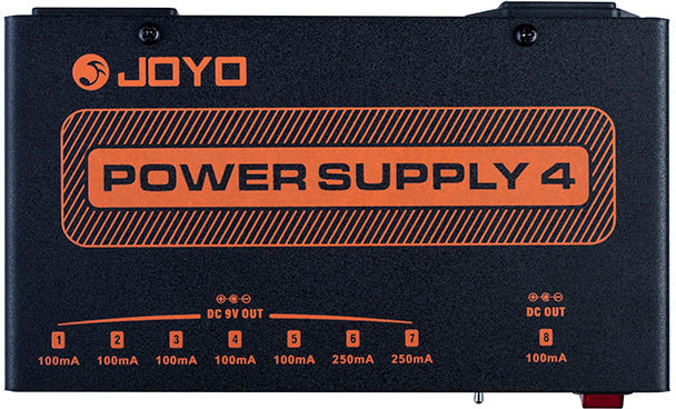 JOYO JP-04 - блок питания педалей эффектов, использующий высококачественный трансформатор для максимально чистого тока, а все выходы полностью изолированы и отрегулированы, каждый имеет свое собственное заземление, защиту от перегрузки и короткого замыкания, а так же фильтр от сетевых наводок. Всего выходов 8: 5х9 В,100 мА, 2х9 В, 250 мА, 1х12/18 В, 100 мА.