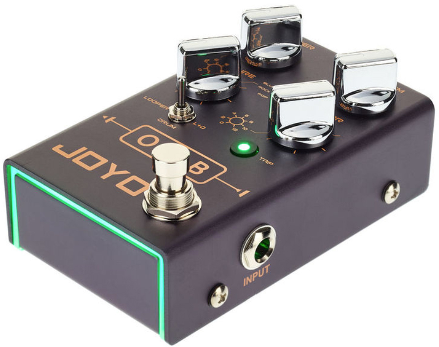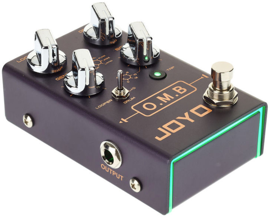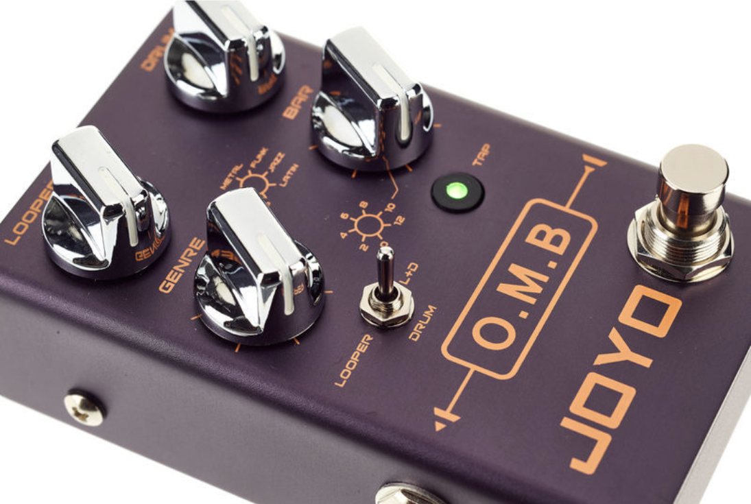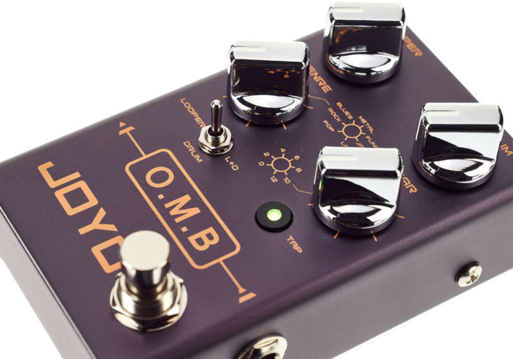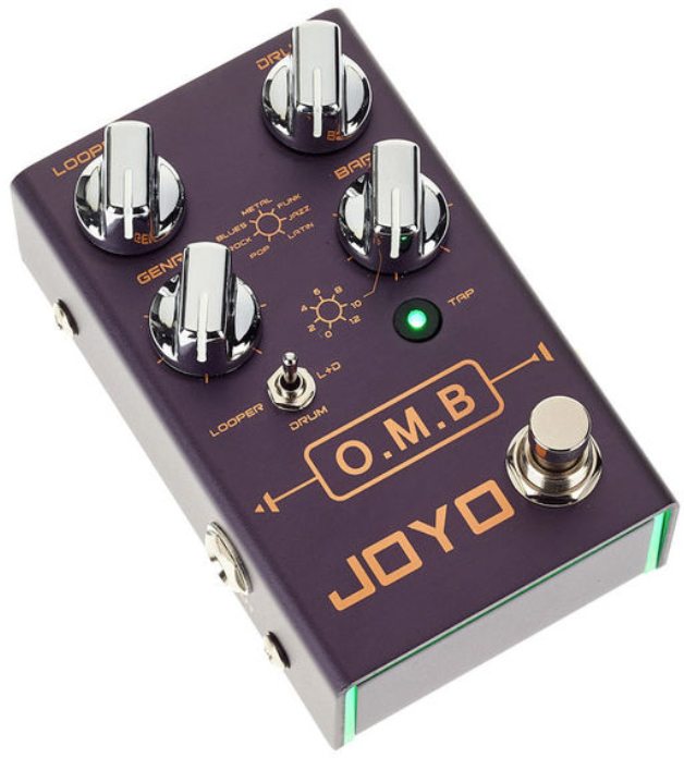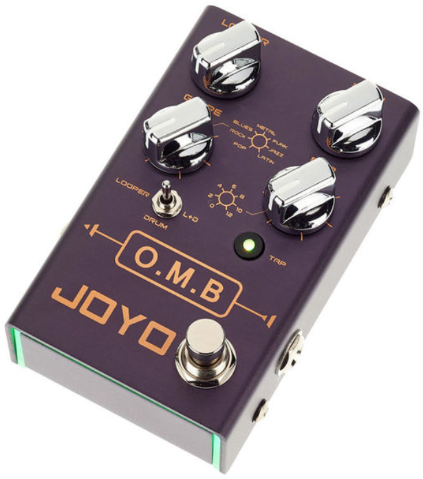 В режиме драм-машины вы можете выбрать 7 жанров ударных с 7 различными битами в каждом. Темп можно задавать с помощью кнопки Tap Tempo, LED индикатор мигает в такт. O.M.B синхронизирует ваш луп с грувом барабанов. Стили ударных – поп, рок, блюз, метал, панк, джаз и латино-американский.