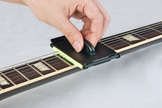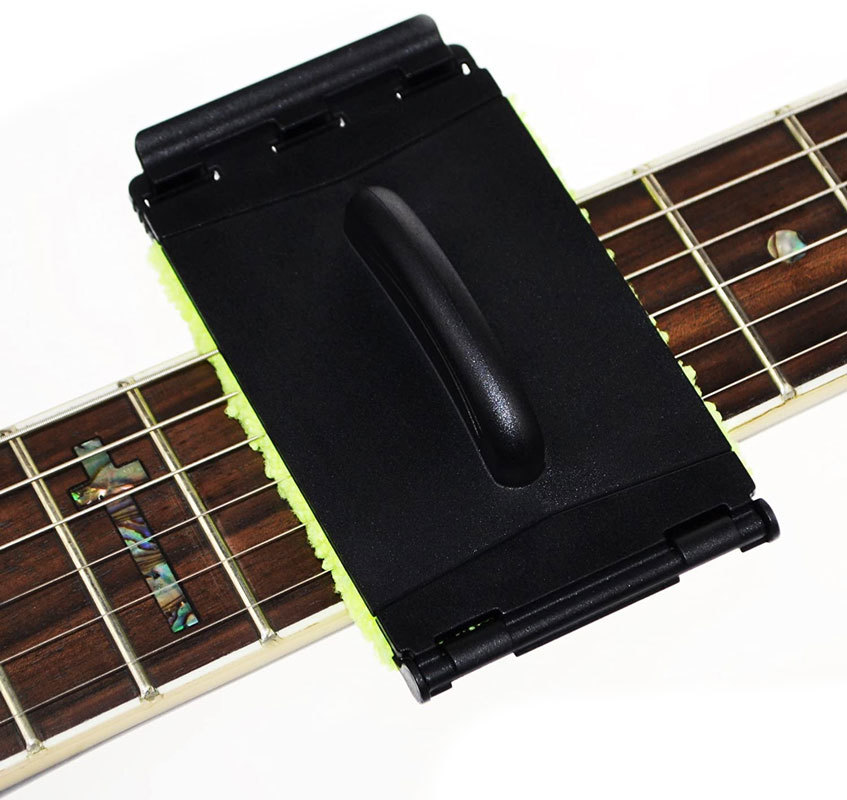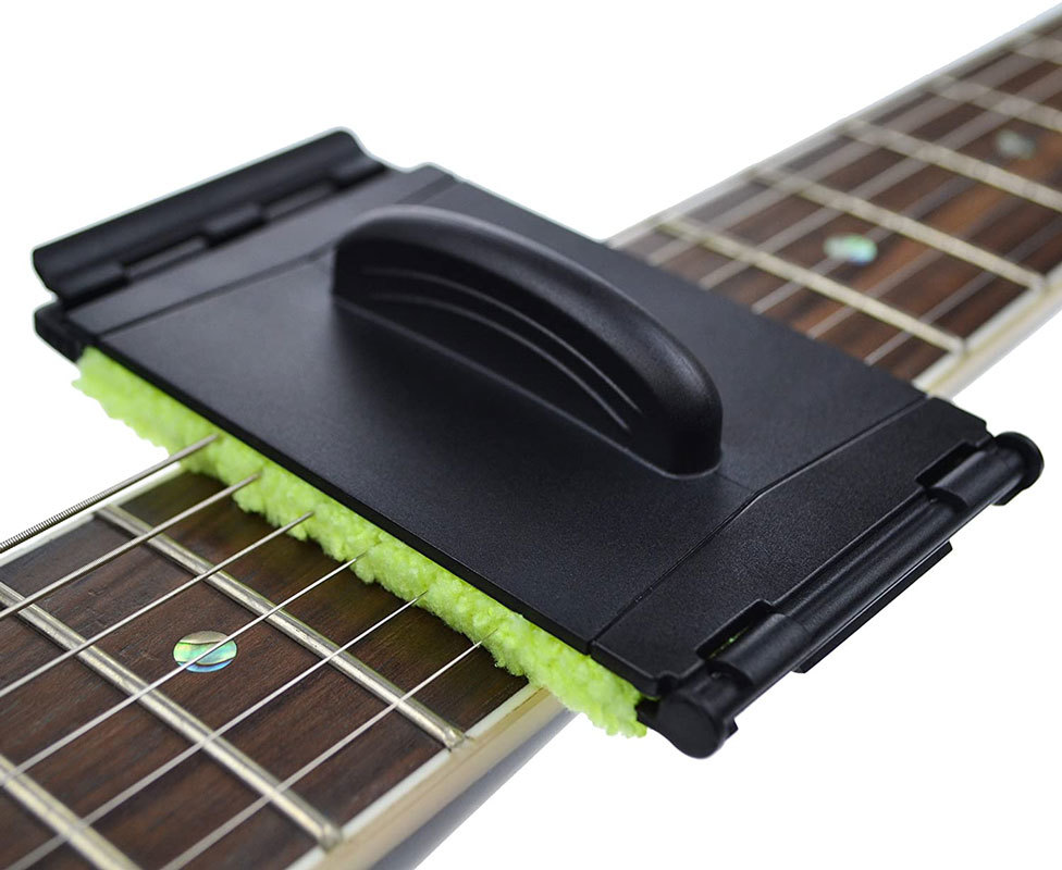 Способ, каким обычно чистят струны гитаристы, довольно хлопотен: нужно оттянуть струны, чтобы протащить тряпочку между струнами и накладкой, затем счистить загрязнения или коррозию с каждой струны по одной.