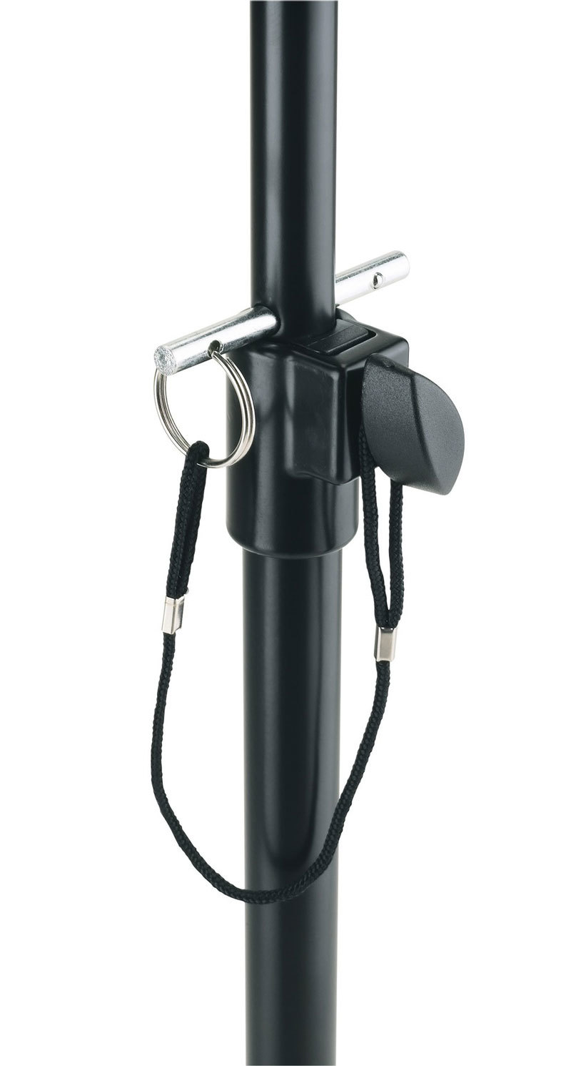 Верхнее крепление выдвигающейся телескопической трубы оснащено блокировочной системой в виде отдельных зажимного и стопорного винтов, а также предохранительным штифтом на цепочке. Все фиксирующие и зажимные винты стойки очень легко можно закручивать руками без использования дополнительного оборудования.