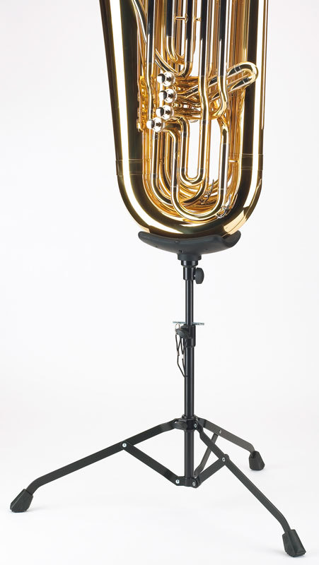 Механизм стойки выполнен в одном из лучших вариантов. Это складная, телескопическая конструкция с тремя откидными опорными ногами. Высота напольной стойки для тубы может изменяться в зависимости от требований музыканта. Для установки тубы на стойку в верхней части находится специальное установочное место с мягким прорезиненным покрытием.