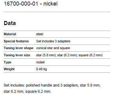 Konig & Meyer 16700-000-01 ключ для настройки фортепиано со сменными насадками. Никелированная сталь. Типы ключей: звёздочка 5,8 мм, звёздочка 6,2 мм, квадрат 6,2 мм.