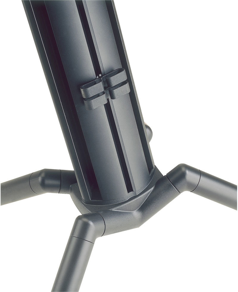 Новое поколение музыкальной стойки ''BABY-SPIDER'', оснащенной парой раздвижных опорных стоек, с 3/8 и 5/8-дюймовыми разъемами для микрофонных штанг и зажимом для кабеля.