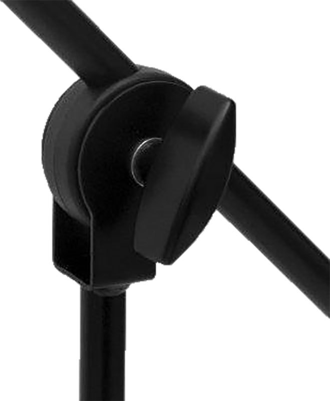 Верхняя часть микрофонной стойки оснащена дополнительной стрелой с фиксатором угла наклона, а также несколькими зажимными/стопорными винтами и Т-образным фиксирующим винтом. Угол наклона стрелы легко регулируется и фиксируется при помощи специального зажимного элемента. На некоторых моделях микрофонных стоек также используется дополнительная стопорная защелка.