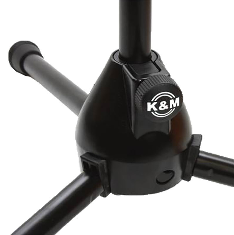 Опорный механизм стойки для микрофона K&M 25900-300-55 выполнен в виде регулируемой по высоте телескопической конструкции имеющей три опорные, складные ноги. Каждая опорная нога оснащена нескользящей подошвой из резины или каучука. Тренога изготавливается из прочных, легковесных металлических труб из специального сплава металла с алюминием.