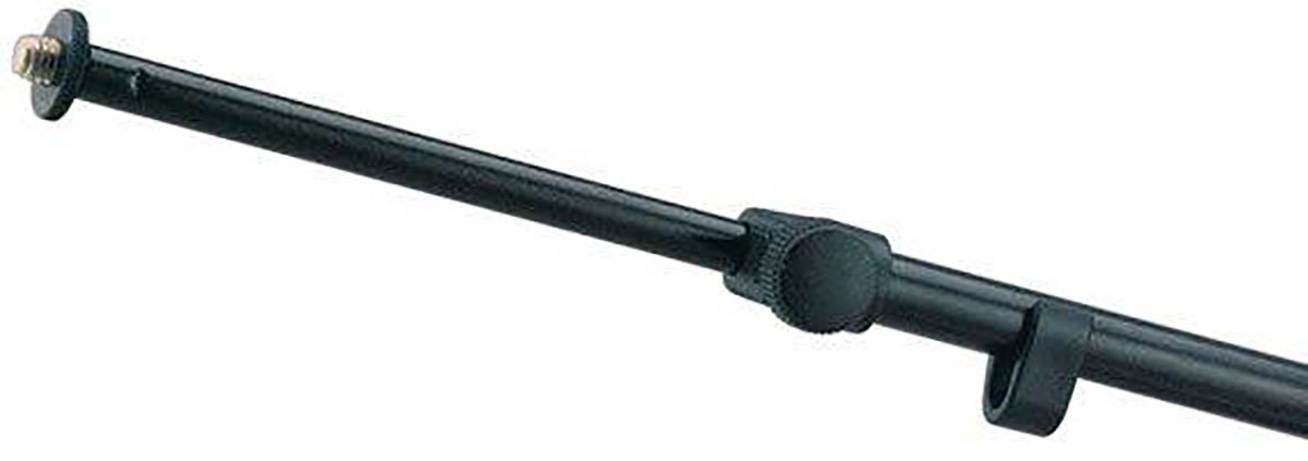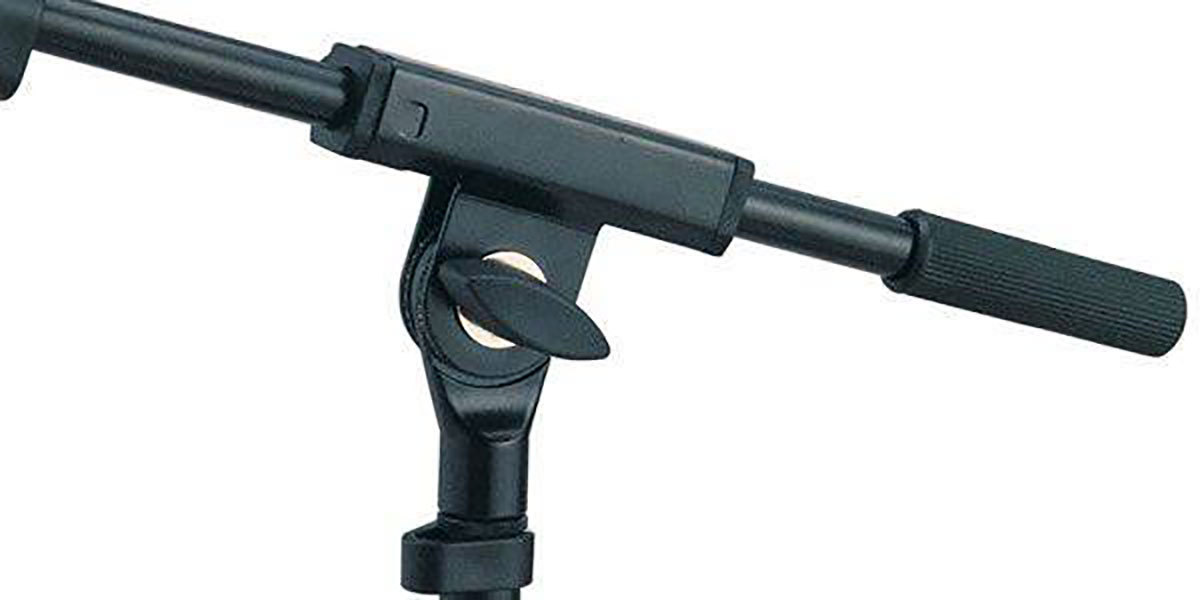 Верхняя часть низкой микрофонной стойки имеет дополнительное плече с несколькими фиксаторами длины и положения в виде нескольких зажимных и стопорных винтов. На некоторых моделях стоек также используется дополнительная стопорная защелка. Угол наклона плеча можно регулировать и фиксировать при помощи специального зажимного элемента. Длина дополнительного плеча может изменяться в пределах от 425 мм. до 725 мм.