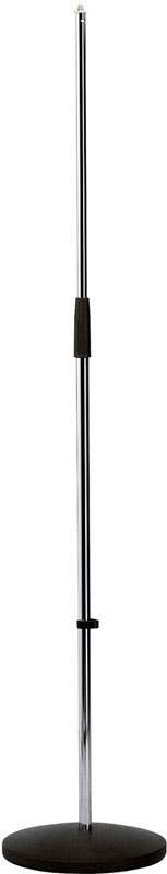 K&M 26010-300-02 прямая микрофонная стойка, круглое основание, высота 870-1575 мм, цвет хром. Стойка с круглым плоским литым цоколем и резиновой антивибрационной вставкой для фильтрации шумов.