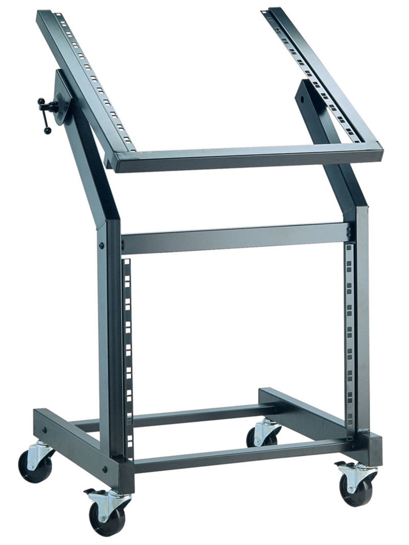 Прочная стальная конструкция с 4-мя роликами, 2 из которых фиксируются. Регулировка по углу наклона до 45 град. при помощи пружинного запорного механизма. 12 выдвижных блоков в верхней секции и 9 в нижней. В комплекте с 32 гайками. Есть дополнительные вентиляционные и глухие панели, полки.