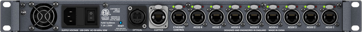 - Мультиплексирует до 8 соединений AES50 в один оптоволоконный кабель или кабель CAT5