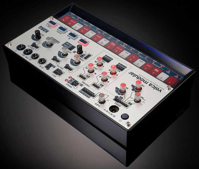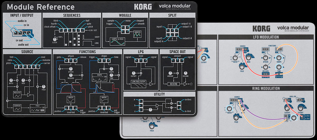 Volca modular - это полумодульный синтезатор, состоящий из независимых аналоговых модулей синтеза, цифровых эффектов и секвенсора. Каждый из модулей был тщательно отобран для его автономной полноты. Модули соединены внутри, так что звук может быть произведен даже до подключения прилагаемых штыревых кабелей, а маршрутизация показана белыми линиями на панели. Соединения модуля через штырьковый кабель имеют приоритет над внутренними соединениями, минуя их.