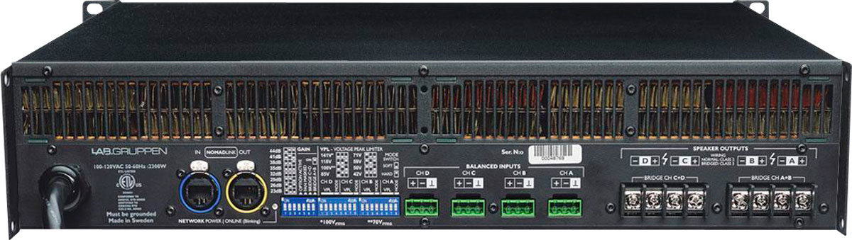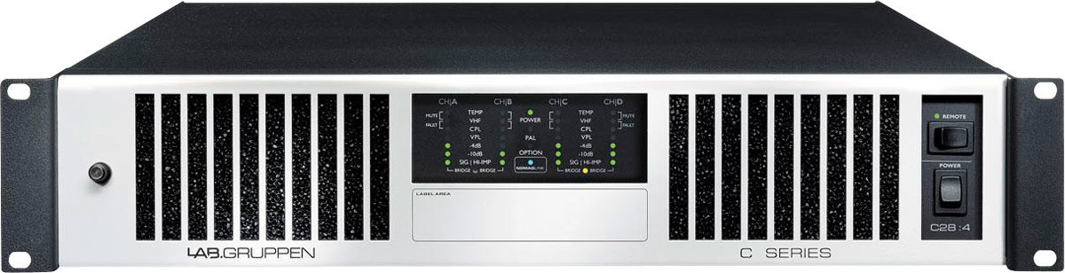 Lab.gruppen C28:4 усилитель 4-канальный. Мощность (на канал): 300 Вт @ 2 Ом, 700 Вт @ 4 Ом, 700 Вт @ 8 Ом, 600 Вт @ 16 Ом, 700 Вт @ 70/100 В. Мощность (мост): 600 Вт @ 4 Ом, 1200 Вт @ 8 Ом, 1400 Вт @ 16 Ом, 1400 Вт @ 140 В. Управление NomadLink. Входы: аналог Phoenix. Подключение: винтовой клеммный зажим. Высота 2U. Вес 12 кг