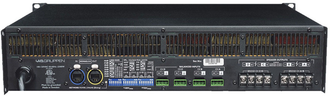 Lab.gruppen C48:4 усилитель 4-канальный. Мощность (на канал): 600 Вт • 2Ω, 1200 Вт • 4Ω, 1000 Вт • 8Ω, 625 Вт • 16Ω, 1100 Вт • 70/100 В. Мощность (мост): 1200 Вт • 4Ω, 2400 Вт • 8Ω, 2000 Вт • 16Ω, 1800 Вт • 140 В. Управление NomadLink. Входы: аналог Phoenix. Подключение: винтовой клеммный зажим. Высота 2U. Вес 12 кг