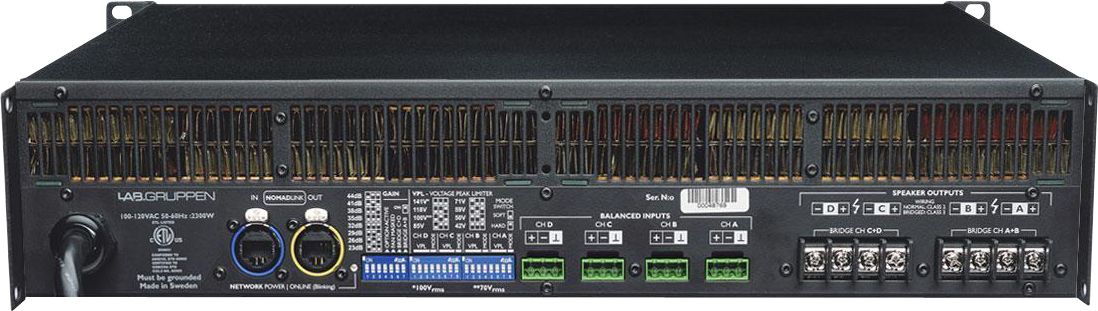 Инсталляционный 4-х канальный усилитель высшего класса с дистанционным мониторингом состояния и включением/выключением (через внешний блок NLB 60). Работа на низкоомную нагрузку и сеть 70/100В. Универсальный импульсный блок питания, некритичный к входному напряжению (130 - 265В). Возможность работы на нагрузку с импедансом 2Ом (1200Вт на канал). Попарное включение каналов в мостовой режим с удвоением мощности (напряжения при работе с высоковольтными сетями). Малые габариты и вес (2U, 12кг). Переключаемый коэффициент усиления напряжения (по умолчанию 35дБ). Отключаемый поканально обрезной фильтр 35Гц.