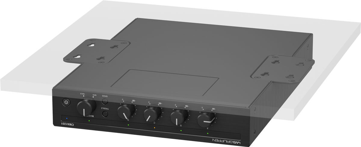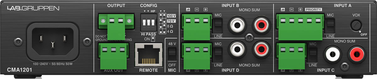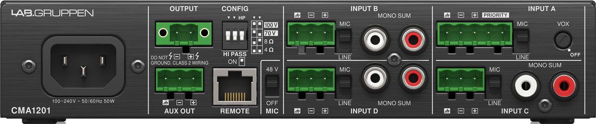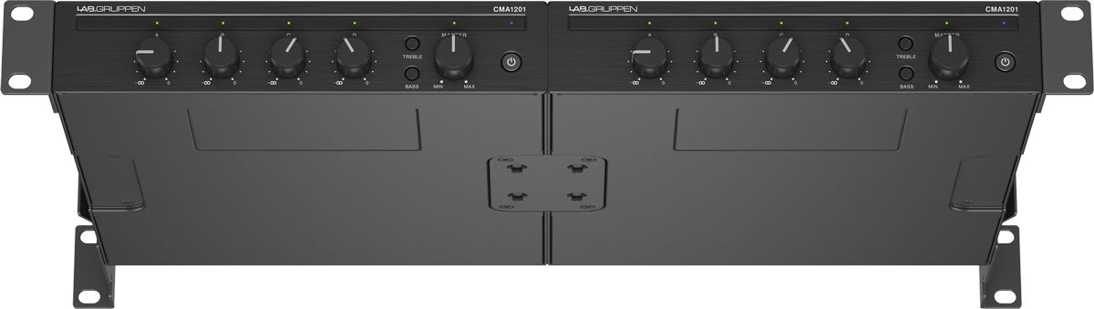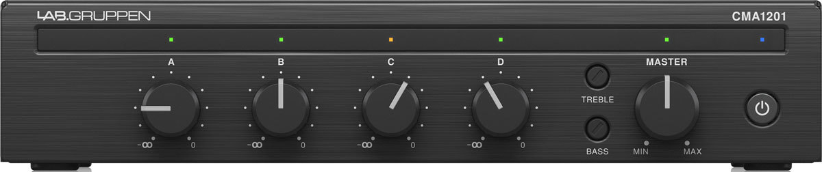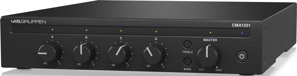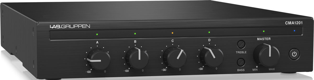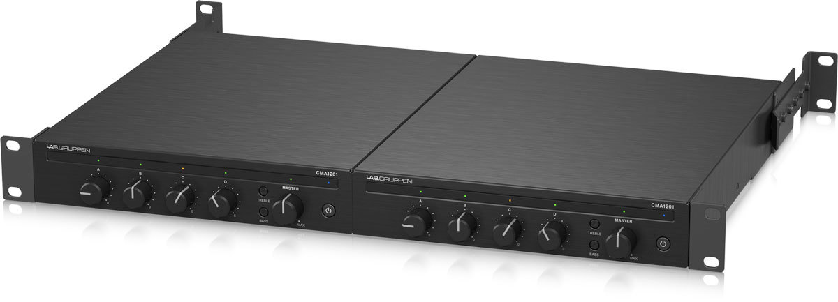 Компактный трансляционный микшер-усилитель Lab.gruppen CMA1201 для небольших инсталляций, сочетает функции модели 4-х канального микшера CM41 и одноканального трансляционного усилителя CA1201. Он позвояет подключить до 4 микрофонов с фантомным питанием или три стереосигнала, которые будут приведены к монофоническому, через разъёмы RCA. Имеется возможность автоматического понижения громкости сигналов 2-4 каналов от микрофона 1 канала, а также от внешнего сигнала управления. Усилительная часть позволяет подключать нагрузку 8 Ом, 4 Ом или транслячионные линии 70В, 100В, обеспечивая на них мощность 120 Вт