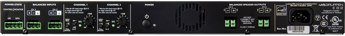 Lab.gruppen E8:2 усилитель 2-канальный. Мощность (на канал): 400 Вт, 2/4/8 Ом, 290 Вт, 6 Ом, 400 Вт, 70 В. Переключение режимов: Lo-Z и Hi-Z. Интерфейс GPIO. Вход: аналог Phoenix. Подключение: аналог Phoenix. Высота 1U. Вес 4,1 кг