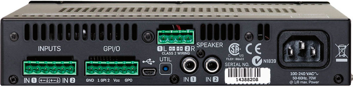 Lab.gruppen Lucia 120/2 2-канальный компактный усилитель для локального применения в распределённых звуковых системах. Класс D, встроенный DSP. 2х60 Вт/2/4/8 Ом, 2х30 Вт/16 Ом, 5-22000 Гц, THD на 1 kHz, 1dB до клипа <0.2%, входная матрица 2х2: 2 стерео- входа: балансный (Euroblock) и небалансный (RCA), выходы Euroblock, GPIО. Лимитер, многополосный компрессор, параметрические эквалайзеры, пресеты для АС Tannoy и пользовательские, автоматическое отключение/включение при отсутствии/появлении сигнала 20мин./2сек., управляемый малошумящий вентилятор. Рабочее напряжение 85-265В, 216 (8,5")х44х280 мм, 1,9 кг. В комплекте настенный кронштейн