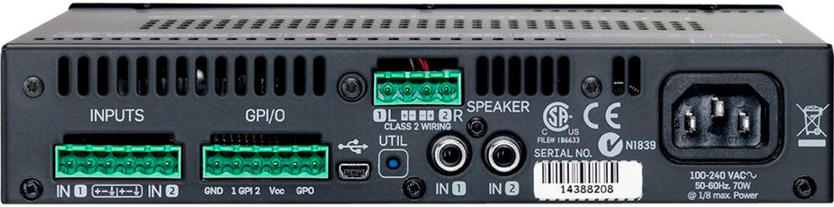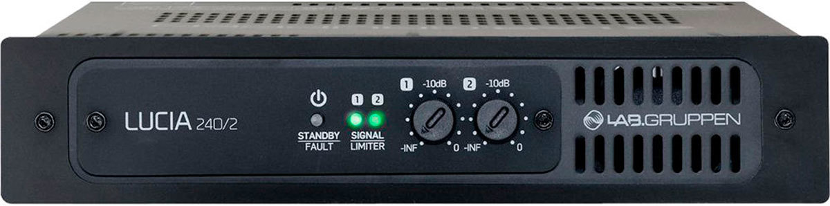 Lab.gruppen Lucia 240/2 2-канальный компактный усилитель для локального применения в распределённых звуковых системах. Класс D, встроенный DSP. 2х120 Вт/2/4/8 Ом, 2х60 Вт/16 Ом, 5-22000 Гц, THD на 1 kHz, 1dB до клипа <0.2%, входная матрица 2х2: 2 стерео- входа: балансный (Euroblock) и небалансный (RCA), выходы Euroblock, GPI. Лимитер, многополосный компрессор, параметрические эквалайзеры, пресеты для АС Tannoy и пользовательские, автоматическое отключение/включение при отсутствии/появлении сигнала 20 мин./ 2 сек., управляемый малошумящий вентилятор. Рабочее напряжение 85-265В, 216 (8,5")х44х280 мм, 1,9 кг. В комплекте настенный кронштейн