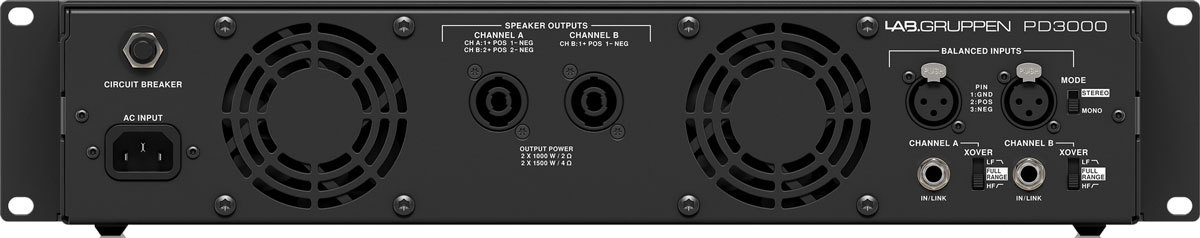 Lab Gruppen PD3000 усилитель 2-канальный. Мощность (на канал): 1000 Вт / 2Ω, 1500 Вт / 4Ω, 800 Вт / 8Ω, кроссовер 100 Гц