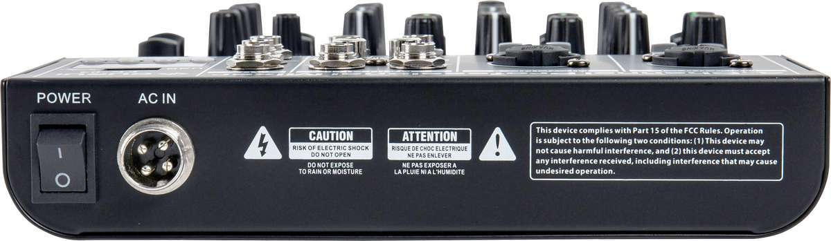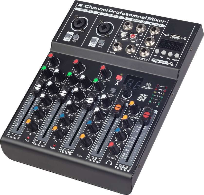 - Усиление, 3-полосный эквалайзер, регуляторы Aux и FX, PAN на каждый канал.