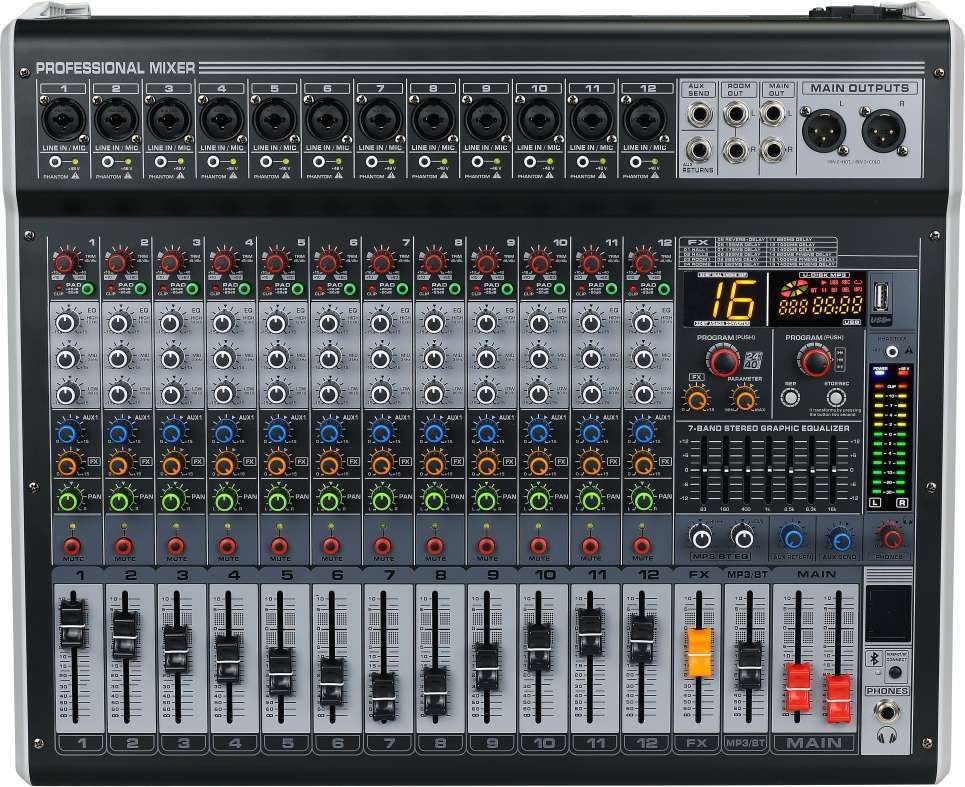 - Подключение Bluetooth и функция записи MP3 через USB. Вставьте USB для воспроизведения музыки или для записи, подключите мобильный телефон к микшеру с помощью Bluetooth соединения.