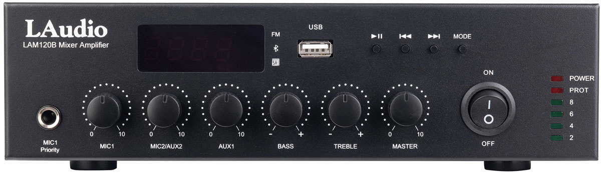 LAM120B - цифровой компактный усилитель с корпусом высотой 1,5U, USB/FM и Bluetooth подключением. Выход на громкоговорители 70 В / 100 В и 4-16 Ом, 3 входа Aux, один микрофонный вход 6,3 мм разъем на передней панели, второй микрофонный вход - XLR на задней панели с фантомным питанием. Индивидуальное управление громкостью для каждого микрофонного и Aux входа, контроль низких и высоких частот. Вход EMC для сигналов чрезвычайных ситуаций.