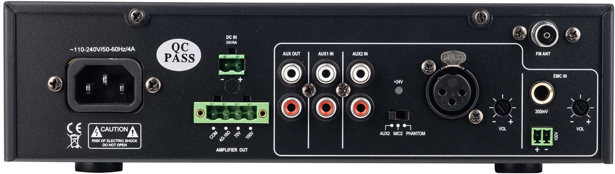 - Выход на громкоговорители 70 В / 100 В и 4-16 Ом, номинальная мощность 120Вт