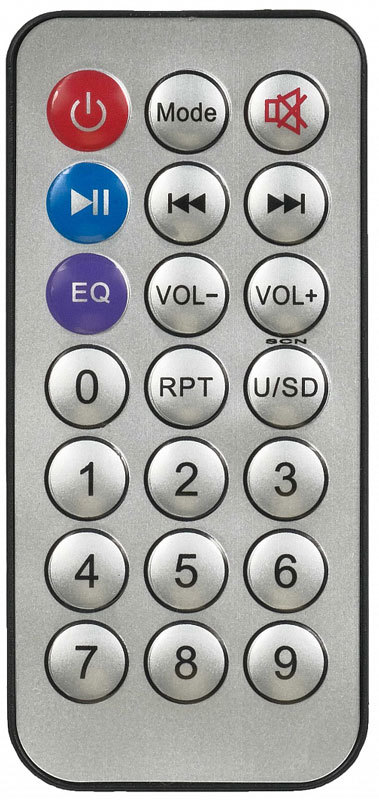 Инфракрасный пульт дистанционного управления для управления MP3/TUNER/BT, который включает переключатели режимов, выбор программы, регулировку громкости, режим повтора, режим эквалайзера и переключатели USB/SD. Светодиодный дисплей показывает громкость, статус воспроизведения, номер программы и т.д.